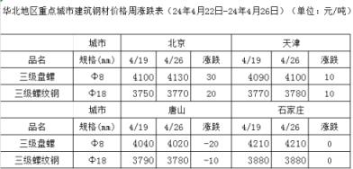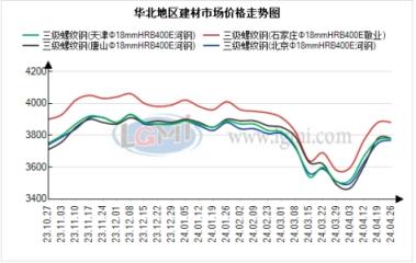 云商平臺監(jiān)測數(shù)據(jù)顯示,截至4月26日午間,天津市場Φ18mm三級抗震螺紋鋼價格為3780元,比上周同期價格漲10元;北京市場Φ18mm三級抗震螺紋鋼價格為3770元,比上周同期價格漲20元;唐山市場Φ18mm三級抗震螺紋鋼價格為3780元,比上周同期價跌10元;石家莊市場Φ18mm三級抗震螺紋鋼價格為3880元,與上周同期價格持平。