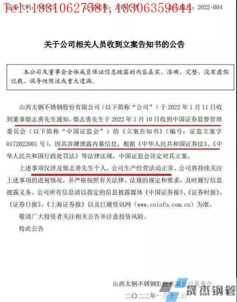 根據(jù)1月12日晚間,太鋼不銹發(fā)布的公告,公司董事柴志勇先生于2022年1月10日收到中國證券監(jiān)督管理委員會的《立案告知書》(編號:證監(jiān)立案字0172022001號),因其涉嫌泄露內幕信息,根據(jù)《中華人民共和國證券法》、《中華人民共和國行政處罰法》等法律法規(guī),中國證監(jiān)會決定對其立案。