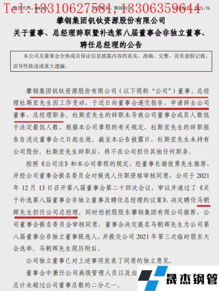 12月13日,攀鋼釩鈦董事會(huì)收到公司董事、總經(jīng)理杜斯宏因工作變動(dòng),于近日向董事會(huì)遞交報(bào)告,申請(qǐng)辭去公司董事、總經(jīng)理職務(wù)。杜斯宏的辭職未導(dǎo)致公司董事會(huì)成員人數(shù)低于法定最低人數(shù),根據(jù)本公司章程的有關(guān)規(guī)定,杜斯宏的辭職報(bào)告自送達(dá)董事會(huì)之日起生效。截至本公告披露日,杜斯宏未持有公司股份。杜斯宏辭職后,將不在公司擔(dān)任其他任何職務(wù)。