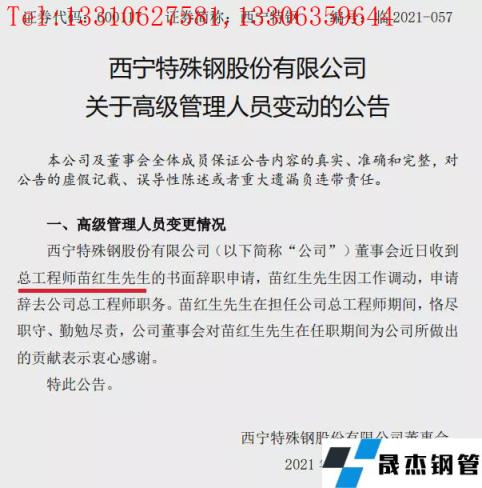 2021年12月10日,西寧特鋼發(fā)布公告,公司人事變動(dòng):董事長(zhǎng)尹良求、總工苗紅生辭職!張伯影擬任董事!