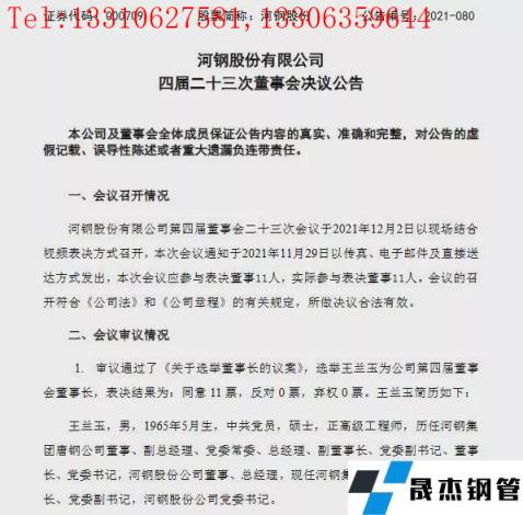 12月3日河鋼股份有限公司(以下簡(jiǎn)稱河鋼股份)發(fā)布了第四屆二十三次董事會(huì)決議公告,據(jù)該公告顯示,河鋼股份第四屆董事會(huì)二十三次會(huì)議于2021年12月2日以現(xiàn)場(chǎng)結(jié)合視頻表決方式召開,會(huì)議審議并通過了《關(guān)于選舉董事長(zhǎng)的議案》,選舉王蘭玉為公司第四屆董事會(huì)董事長(zhǎng)。