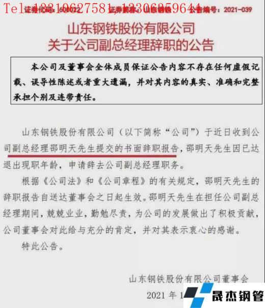 12月1日,山東鋼鐵發(fā)布公告稱,于近日收到公司副總經(jīng)理邵明天先生提交的書面辭職報(bào)告。邵明天先生因已達(dá)退出現(xiàn)職年齡,申請(qǐng)辭去公司副總經(jīng)理職務(wù)。
