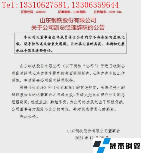12月27日,山東鋼鐵發(fā)布公告,公司于近日收到公司副總經(jīng)理王培文提交的書面辭職報(bào)告,王培文因工作調(diào)整,申請辭去公司副總經(jīng)理職務(wù)。