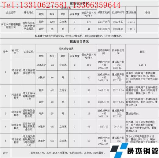 河北新金鋼鐵有限公司退出450m3高爐2座,產(chǎn)能104萬噸/年;40t轉(zhuǎn)爐1座,產(chǎn)能60萬噸/年。河北永洋特鋼集團(tuán)有限公司退出450m3高爐1座,產(chǎn)能52萬噸/年;70t電爐1座,產(chǎn)能30萬噸/年。邯鄲市紫山特鋼集團(tuán)有限公司退出35t電爐1座,產(chǎn)能13萬噸/年。武安市廣耀鑄業(yè)有限責(zé)任公司退出460m3高爐1座,產(chǎn)能53萬噸/年。河北新武安鋼鐵集團(tuán)鑫山鋼鐵有限公司退出600m3高爐1座,產(chǎn)能65萬噸/年。