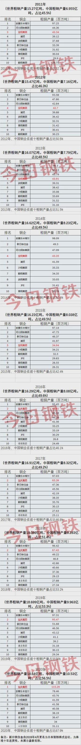 2021年8月,世界鋼鐵協(xié)會發(fā)布《世界鋼鐵統(tǒng)計數(shù)據(jù)2020》該統(tǒng)計數(shù)據(jù)根據(jù)2020年粗鋼產量情況對全球鋼鐵企業(yè)進行排名,并發(fā)布了全球前50大鋼鐵企業(yè)名單。中國寶武以2020年11529萬噸粗鋼產量位列榜首!這也是中國鋼企首次登頂世界之巔,也是世界鋼鐵企業(yè)首次沖破一億噸粗鋼產量大關!