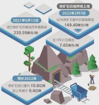 中國(guó)鐵礦石價(jià)格指數(shù)監(jiān)測(cè)顯示,62%鐵礦石直進(jìn)月均價(jià)已從2021年11月94.57美元/噸,升至2022年2月均價(jià)148.27美元/噸,2022年2月10日單日價(jià)格達(dá)到152.46美元/噸。