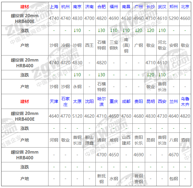全國(guó)24個(gè)主要市場(chǎng)螺紋鋼 20mm HRB400E平均價(jià)格4765元/噸,較上個(gè)交易日下調(diào)5元/噸。