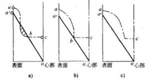 表中數(shù)據(jù)表明:感應(yīng)加熱淬火半軸的靜扭強(qiáng)度高于調(diào)質(zhì)半軸,感應(yīng)加熱淬火層愈深,其靜扭強(qiáng)度愈高。數(shù)據(jù)還表明,40MnB鋼中頻感應(yīng)加熱淬火可以代替40CrMnMo鋼調(diào)質(zhì)半軸。表5 中數(shù)據(jù)還表明:中頻感應(yīng)加熱淬火半軸疲勞壽命比調(diào)質(zhì)半軸提高很多倍,因此半軸調(diào)質(zhì)處理工藝多數(shù)已被中頻感應(yīng)加熱淬火所取代。(2)半軸感應(yīng)加熱淬火工藝參數(shù)的選擇:半軸淬硬層深度的確定應(yīng)以保證半軸內(nèi)任何一點(diǎn)的扭轉(zhuǎn)應(yīng)力均小于或等于該點(diǎn)的剪切屈服強(qiáng)度。圖3 中點(diǎn)劃線表示半軸感應(yīng)加熱淬火后的強(qiáng)度分布情況,a'o表示半軸的扭轉(zhuǎn)應(yīng)力分布情況。若淬硬層太淺,則半軸強(qiáng)度不足,圖3a中b'b區(qū)域?yàn)槲kU(xiǎn)區(qū);若淬硬層太深,圖3c,則由于半軸表層殘留壓應(yīng)力降低而降低疲勞壽命。合適的淬硬層深度應(yīng)如圖3b所示。