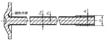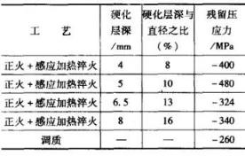 ▲圖3半軸工藝淬火硬化層與強(qiáng)度分布a)太淺b)合適c)太深桿部:硬化層深度應(yīng)達(dá)到桿部直徑的15%(δ2=15%D0)。法蘭根部:要求法蘭盤與桿部連接的過渡圓角淬硬。在實(shí)際生產(chǎn)中,圓角處硬化區(qū)域的最小直徑應(yīng)比半軸桿部直徑大25%。這些要求是為了保證半軸的靜強(qiáng)度和疲勞強(qiáng)度?;ㄦI與桿部的淬硬層深度對(duì)靜強(qiáng)度影響較大,法蘭圓角淬硬對(duì)疲勞極限影響較大。每種表面淬火半軸都有最佳的硬化層深,應(yīng)考慮到硬化層深對(duì)表層殘留壓應(yīng)力的影響。表6 列出了直徑為50mm的帶法蘭半軸感應(yīng)加熱淬火后花鍵尾根部位的殘留壓應(yīng)力。通常,感應(yīng)加熱淬火硬化層深度可以根據(jù)半軸桿部直徑的大小和產(chǎn)品設(shè)計(jì)結(jié)構(gòu)形狀來確定。對(duì)輕型載重車和小轎車的法蘭盤式半軸(桿部直徑在50mm以下)淬硬層深度可按下列要求確定(參閱圖4)。