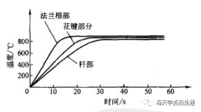 ▲圖6半軸整體淬火感應(yīng)器半軸連續(xù)淬火存在效率低,不便于機(jī)械化和自動(dòng)化的缺點(diǎn),而且連續(xù)淬火使半軸靠近光桿的花鍵區(qū)常常產(chǎn)生軟帶,強(qiáng)度較低,使用中往往在花鍵尾部斷裂。這是由于感應(yīng)器移到該處時(shí),磁感應(yīng)線強(qiáng)烈地偏移到未失去鐵磁性的光桿部位所引起的。采用矩形感應(yīng)器進(jìn)行整體一次感應(yīng)加熱時(shí),其有效圈電流方向平行于半軸軸線線,并產(chǎn)生垂直于工件軸線的橫向磁場(chǎng),所以半軸的軸向幾何尺寸變化(如花鍵一光桿、多階軸及臺(tái)肩軸等)時(shí),不會(huì)引起磁感應(yīng)線的偏移。所以工件表面的感應(yīng)電流是均勻的,半軸表面可以獲得均勻加熱。圖7 是帶法蘭的半軸采用矩形感應(yīng)器整體一次感應(yīng)加熱淬火時(shí)實(shí)際觀察的表面均溫加熱曲線。