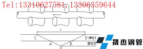 縱向彎曲矯直是使厚壁鋼管產(chǎn)生與彎曲相反方向的塑性變形來達到矯直彎曲的目的,而不彎曲的管子斷面只產(chǎn)生彈性變形,塑性變形區(qū)占支撐距的40%長度。