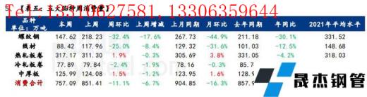 消費(fèi)方面,本周五大品種周消費(fèi)量增至757.09萬(wàn)噸,環(huán)比減少94.32萬(wàn)噸,降幅11.1%。其中建材環(huán)比減少100.15萬(wàn)噸,降幅29.79%,板材環(huán)比增加5.83萬(wàn)噸,增幅1.13%。