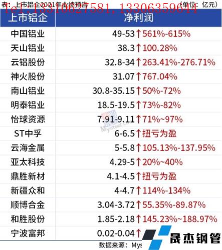 免責聲明:本網(wǎng)站(山東聊城晟杰無縫鋼管廠www.androidrecoverysoftware.com)刊載的“15家上市鋁企2021年業(yè)績飄紅,神火股份大增超7倍”等均源于網(wǎng)絡,版權(quán)歸原作者所有,且僅代表原作者觀點,本文所載信息僅供參考。轉(zhuǎn)載僅為學習與交流之目的,如無意中侵犯您的合法權(quán)益,請及時聯(lián)系刪除。本網(wǎng)站刊登此篇文章并不意味著本站贊同其觀點或證實其內(nèi)容的真實性,我們不對其科學性、嚴肅性等作任何形式的保證。如果侵犯了您的版權(quán),請盡快聯(lián)系我們予以撤銷,謝謝合作!