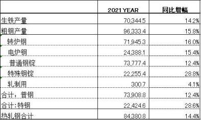 根據(jù)日本鋼鐵協(xié)會的統(tǒng)計,2021年日本生鐵產(chǎn)量為7034萬噸,同比增長14.2%。粗鋼產(chǎn)出當(dāng)中,轉(zhuǎn)爐鋼產(chǎn)量為7194.5萬噸,同比提高16%,電爐鋼產(chǎn)量達2438.8萬噸,同比增長15.4%。