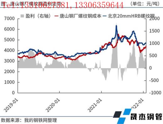 成本方面,據(jù)筆者測(cè)算,1月底唐山長(zhǎng)流程無(wú)縫鋼管廠家螺紋鋼噸鋼毛利(成本不包含三項(xiàng)費(fèi)用、折舊等)300元/噸左右。由于1月份原燃料價(jià)格漲幅高于鋼價(jià),導(dǎo)致無(wú)縫鋼管廠家效益有所下滑,部分電爐廠因虧損減產(chǎn)。