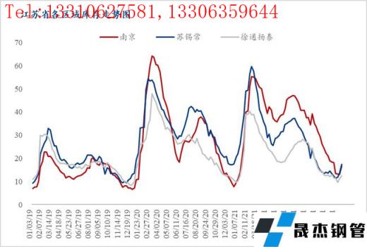 如上圖所示,2020年1月23日省會南京市場庫存占全省現(xiàn)貨庫存的21%左右,屬全年較低水平;而4月9日前后基本占全省庫存的41%;20年上半年南京市場庫存均保持較高水平,而下半年開始庫存便逐漸走低,蘇錫常庫存累庫增加。2021年1月8日南京庫存占全省庫存的24%,從4月初開始到本年度結(jié)束,南京庫存占比基本維持在40-42%左右,11月5日占比最高達到年度最高值,約50/%。2021年全年,南京市場庫存均保持較高水平,僅在年初階段,蘇錫??値齑媛愿哂谀暇Uw來看,今年南京市場現(xiàn)貨資源一直處于相對充裕的狀態(tài),且部分無縫厚壁鋼管廠家?guī)齑媲耙埔彩潜WC該市場建材供給較為穩(wěn)定的重要因素,而徐通揚泰區(qū)域則因價格波幅巨大,市場參與者主動囤貨意愿不高,全年庫存相較去年小幅減量。