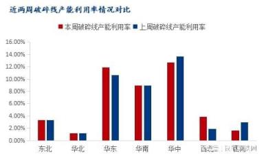 截止2月09日,統(tǒng)計(jì)全國242條廢鋼破碎線開工情況,廢鋼破碎線開工率為26.64%,較上周增2.87%,本周全國廢鋼破碎線開工率小增。全國區(qū)域?qū)Ρ瓤?,東北、華北、華南、西南地區(qū)破碎線開工率較上周持平,華東地區(qū)破碎線開工率較上周增6.25%,華中地區(qū)破碎線開工率較上周降5%,西北地區(qū)破碎線開工率較上周增6.67%。