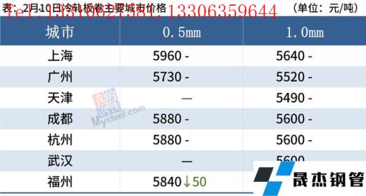 冷軋板卷:2月10日,全國(guó)24個(gè)主要城市1.0mm冷卷均價(jià)5593元/噸,較上個(gè)交易日下跌1元/噸。今日黑色系期貨盤面整體呈低開高走的態(tài)勢(shì),在期貨盤面的影響下,午后市場(chǎng)詢單人數(shù)明顯增加,但由于下游客戶觀望情緒較為濃厚,今日整體成交一般。庫(kù)存方面,據(jù)不完全統(tǒng)計(jì),現(xiàn)冷軋無縫厚壁鋼管廠家?guī)齑?3.71萬噸,周環(huán)比增加0.5萬噸,社會(huì)庫(kù)存139.17萬噸,周環(huán)比增加5.47萬噸,周消費(fèi)量67.89萬噸,環(huán)比減少1.26萬噸。綜合來看,故預(yù)計(jì)11日國(guó)內(nèi)冷軋板卷價(jià)格或?qū)⒄鹗庍\(yùn)行。
