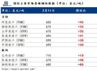 本周獨(dú)聯(lián)體價(jià)格持續(xù)上漲。目前方坯出口價(jià)格約為670-680美元/噸FOB,較節(jié)前上漲約30美元/噸。