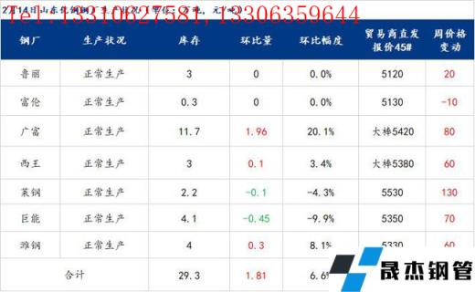 2月14日山東優(yōu)特?zé)o縫厚壁鋼管廠家棒材總庫(kù)存29.3萬(wàn)噸,環(huán)比增加1.81萬(wàn)噸,增幅6.58%,較去年春節(jié)后第二周庫(kù)存增加4.1萬(wàn)噸。