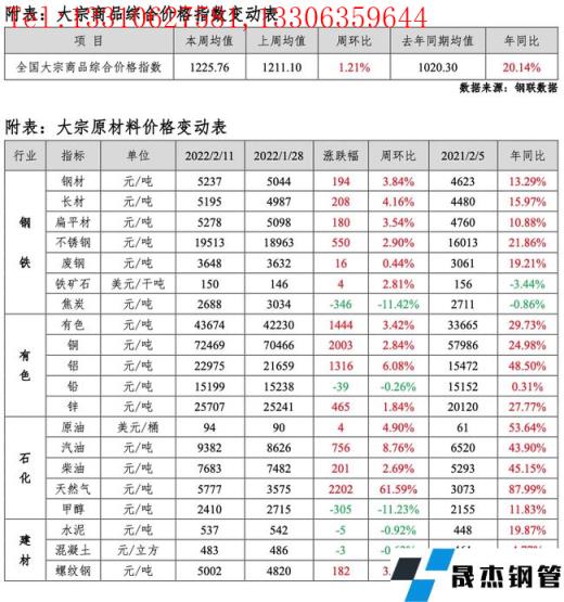 免責(zé)聲明:本網(wǎng)站(山東聊城晟杰無(wú)縫鋼管廠www.androidrecoverysoftware.com)刊載的“MRI:大宗原材料價(jià)格周報(bào)(2月7日-2月11日)”等均源于網(wǎng)絡(luò),版權(quán)歸原作者所有,且僅代表原作者觀點(diǎn),本文所載信息僅供參考。轉(zhuǎn)載僅為學(xué)習(xí)與交流之目的,如無(wú)意中侵犯您的合法權(quán)益,請(qǐng)及時(shí)聯(lián)系刪除。本網(wǎng)站刊登此篇文章并不意味著本站贊同其觀點(diǎn)或證實(shí)其內(nèi)容的真實(shí)性,我們不對(duì)其科學(xué)性、嚴(yán)肅性等作任何形式的保證。如果侵犯了您的版權(quán),請(qǐng)盡快聯(lián)系我們予以撤銷,謝謝合作!