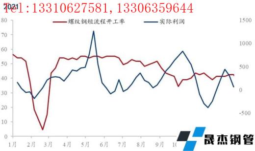 而對于2021年的數(shù)據(jù)來說無論是相關(guān)分析還是回歸分析結(jié)果表現(xiàn)出與其他年份有不同的結(jié)果,這與2021年的特殊情況有關(guān)。由于2021年螺紋鋼價格的急劇變化,導(dǎo)致電弧爐實際利潤具有了極強(qiáng)的波動性,而且由于能耗雙控,從8月底電弧爐無縫厚壁鋼管廠家被嚴(yán)格限產(chǎn),導(dǎo)致了電弧爐開工率有近20%左右的持續(xù)下降,創(chuàng)造了歷史低位,政策以及成材價格變動明顯干擾了數(shù)據(jù)的觀測,如下圖所示: