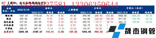 據(jù)統(tǒng)計,本周五大品種庫存總量為2300.08萬噸,環(huán)比上周增加110.41萬噸,其中建材庫存增加100.78萬噸,增幅為7.0%;板材庫存增加9.63萬噸,增幅1.3%。上期庫存總量為2189.67萬噸,環(huán)比節(jié)后第一周增加159.65萬噸,其中建材庫存增加111.2萬噸,增幅為8.4%;板材庫存增加48.45萬噸,增幅6.8%。