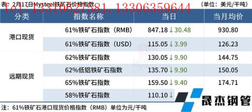 ◎ 2月17日,統(tǒng)計(jì)新口徑114家無縫厚壁鋼管廠家進(jìn)口燒結(jié)粉總庫存3427.74萬噸,燒結(jié)粉總?cè)蘸?8.11萬噸。原口徑64家無縫厚壁鋼管廠家進(jìn)口燒結(jié)粉總庫存1678.22萬噸,燒結(jié)粉總?cè)蘸?2.64萬噸,庫存消費(fèi)比39.4,燒結(jié)礦中平均使用進(jìn)口礦配比86.46%。