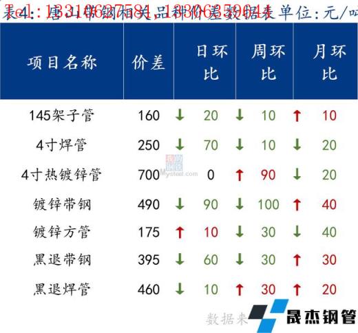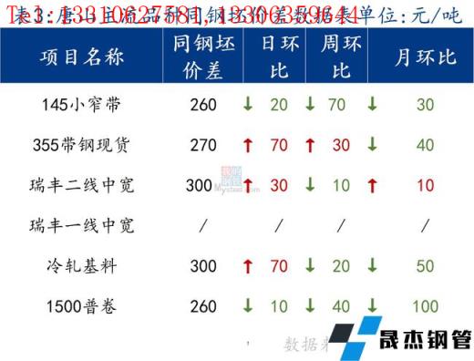 145帶鋼與鋼坯價(jià)差小幅收窄,焊管與355帶鋼價(jià)差收窄。熱卷與帶鋼價(jià)差縮小,價(jià)格基本持平。