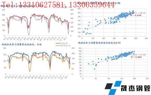 無(wú)縫厚壁鋼管廠家出庫(kù)量(周實(shí)際產(chǎn)量-無(wú)縫厚壁鋼管廠家?guī)齑姝h(huán)比變化)與周表觀消費(fèi)量(產(chǎn)量-總庫(kù)存環(huán)比變化;總庫(kù)存=無(wú)縫厚壁鋼管廠家?guī)齑?社會(huì)庫(kù)存)高度相關(guān),以主要品種建筑厚壁無(wú)縫鋼管為例,螺紋鋼和線材的無(wú)縫厚壁鋼管廠家出庫(kù)量與周表觀消費(fèi)量相關(guān)系數(shù)均高達(dá)0.9。