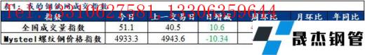 訊:全國(guó)建筑厚壁無(wú)縫鋼管成交量監(jiān)測(cè),成交量相對(duì)指數(shù)來(lái)看,全國(guó)51.1增10.6,北方20增3.7,華東80.1增20,南方39.2增5。今日螺紋鋼價(jià)格指數(shù)4933.3,較上一交易日減10.34。