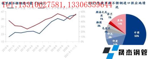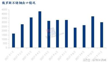 在需求增長帶動下,近年來俄羅斯不銹鋼進(jìn)口量大幅提升,2021年1-11月進(jìn)口量累計(jì)約43.57萬噸,其中中國進(jìn)口占比約55%。
