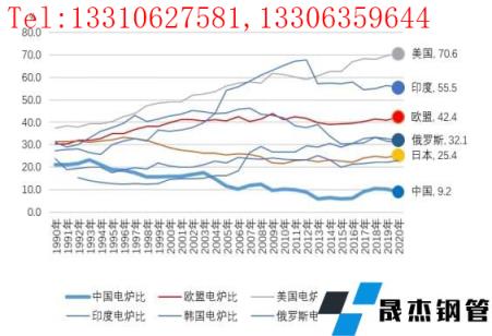 電爐鋼是以電力為能源、以再生鋼鐵料為原料的煉鋼爐生產(chǎn)的鋼。這種短流程煉鋼與以鐵礦石為主要原料的長流程煉鋼在原料使用上有本質(zhì)的區(qū)別。從電爐鋼的占比情況看,中國粗鋼生產(chǎn)90%以上依賴長流程,即以鐵礦石為主要原料的生產(chǎn)方式,并且受制于國產(chǎn)鐵精礦的產(chǎn)量不足,對進口鐵礦石的依存度很高。截止到2020年,據(jù)世界鋼協(xié)(WSA)的統(tǒng)計數(shù)據(jù),全球電爐鋼產(chǎn)量占比為26.1%。主要產(chǎn)鋼國中,美國為70.6%,土耳其為69.2%,印度電爐比為55.5%,歐盟(28)為42.4%,俄羅斯為32.1%,韓國為31.0%,日本為25.4%。中國電爐鋼占比在20世紀90年代曾超過20%,但由于之后中國長流程煉鋼規(guī)模迅速擴大,電爐鋼占比不斷被稀釋,至2020年已降至9.2%。從目前情況看,美國、印度和歐盟鋼鐵生產(chǎn)對鐵礦石依存度相對低很多。