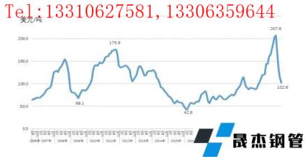 2006年1月-2021年12月進口鐵礦石月度平均價格走勢圖