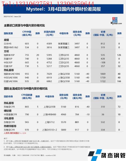 免責(zé)聲明:本網(wǎng)站(山東聊城晟杰無縫鋼管廠www.androidrecoverysoftware.com)刊載的“2022年03月04日日報(bào):國內(nèi)外鋼材_無縫鋼管價(jià)差匯總(2022.3.4)”等均源于網(wǎng)絡(luò),版權(quán)歸原作者所有,且僅代表原作者觀點(diǎn),本文所載信息僅供參考。轉(zhuǎn)載僅為學(xué)習(xí)與交流之目的,如無意中侵犯您的合法權(quán)益,請及時(shí)聯(lián)系刪除。本網(wǎng)站刊登此篇文章并不意味著本站贊同其觀點(diǎn)或證實(shí)其內(nèi)容的真實(shí)性,我們不對其科學(xué)性、嚴(yán)肅性等作任何形式的保證。如果侵犯了您的版權(quán),請盡快聯(lián)系我們予以撤銷,謝謝合作!