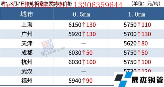 冷軋板卷:3月7日,全國24個主要城市1.0mm冷卷均價5711元/噸,較上個交易日上漲68元/噸。據局部區(qū)域貿易商反饋,今日冷軋價格漲幅明顯,市場交投情緒濃郁,商戶多以出貨兌現(xiàn)為主,中小貿易商逢低補貨,下游行業(yè)訂貨量有所增加;近日無縫厚壁鋼管廠家資源陸續(xù)倒庫,庫存壓力偏大,東南地區(qū)主流市場庫存偏高。綜合來看,預計8日全國冷軋價格仍有小幅補漲空間。