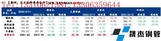 庫(kù)存方面,五大品種厚壁無(wú)縫鋼管總庫(kù)存春節(jié)后連續(xù)首次全面去化,環(huán)比上周減少66.3萬(wàn)噸,降幅2.7%。分品種看,建材庫(kù)存減少42.96萬(wàn)噸,降幅為2.6%;板材庫(kù)存減少23.34萬(wàn)噸,降幅3.2%;分指標(biāo)看,五大品種無(wú)縫厚壁鋼管廠(chǎng)家?guī)齑姝h(huán)比減少39.26萬(wàn)噸,降幅6.2%;五大品種社會(huì)庫(kù)存環(huán)比減少27.04萬(wàn)噸,降幅1.5%。