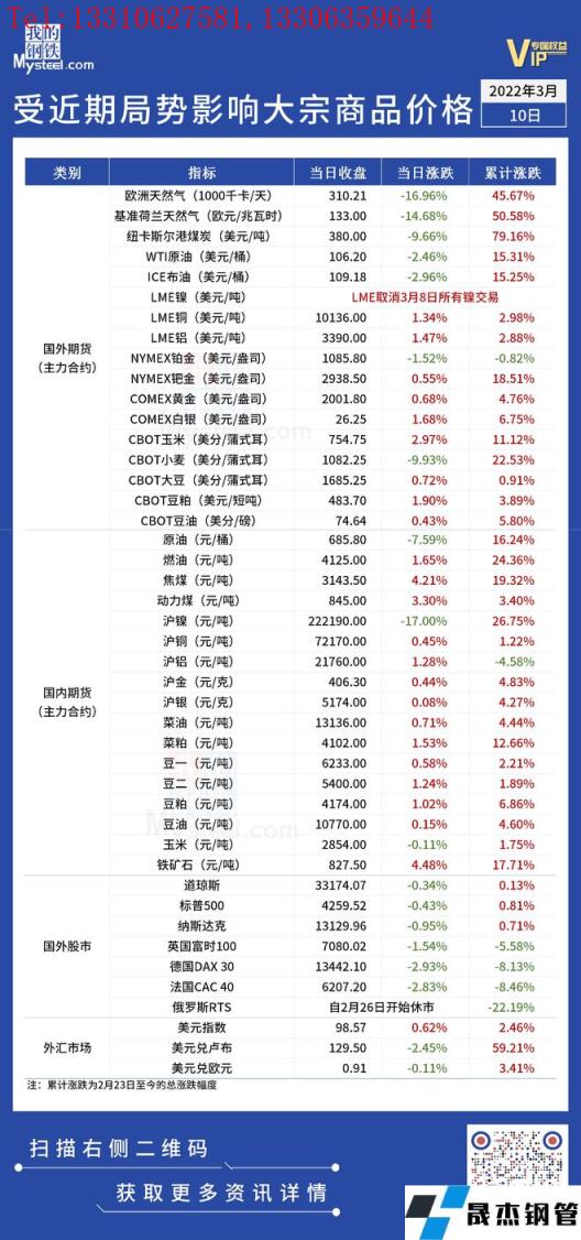 近期,受國際局勢影響,全球金融及大宗商品市場出現(xiàn)較大波動。3月10日,國際能源價格繼續(xù)大幅回落,滬鎳主力合約恢復(fù)交易后跌停。匯總情況如下: