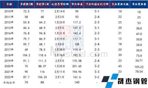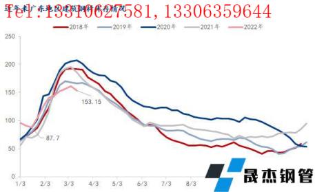 對比歷史數(shù)據(jù)來看,近10年來春節(jié)后廣州建筑厚壁無縫鋼管庫存峰值均出現(xiàn)第3-5周,累庫周期約24天左右;近5年來節(jié)后庫存累庫量明顯上升,節(jié)后峰值水平均超過150萬噸以上,而2017年之前節(jié)后庫存峰值均在140萬噸以內。近年來,隨著經(jīng)濟發(fā)展以及供應擴張,春節(jié)前市場主動性冬儲積極性增加,整體的庫存量出現(xiàn)明顯上升; 雖然2022年節(jié)前價格偏高,但節(jié)前現(xiàn)貨價格上漲,帶動市場不少商家主動性囤貨、備貨,節(jié)前庫存總量并未出現(xiàn)明顯累庫現(xiàn)象。節(jié)后開市,在疫情等因素影響下,累庫速度遠低于去年,今年庫存呈現(xiàn)的特點是,累庫速度快,累庫量大,周期短等特點。同時再加上今年節(jié)后不少短流程企業(yè)并未完全恢復生產(chǎn),自然資源供應量有所減量,節(jié)后累庫低于往年,且今年峰值出現(xiàn)在3月第1周,第二周迎來庫存拐點。