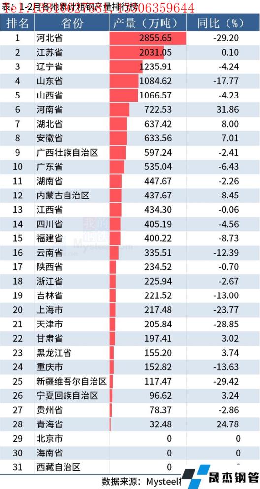 從分省數(shù)據(jù)來(lái)看,有4個(gè)省份1-2月粗鋼產(chǎn)量同比降幅超過(guò)20%。其中河北降29.20%、上海降23.77%,天津降28.85%和新疆降29.42%。具體情況如下: