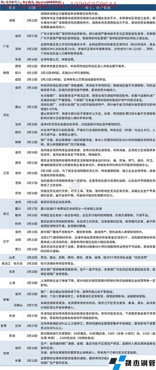 截至3月22日,匯總了16個省份停工復(fù)工最新信息。其中,湖南省本地鋼企對廢鋼送貨車輛管控有所升級;主流廢鋼基地疫情管控措施與此前相比變化不大,多數(shù)基地正常加工出貨,部分基地對進(jìn)廠車輛管控較前期有所升。唐山長流程無縫厚壁鋼管廠家目前整體生產(chǎn)情況正常,但受全域交通臨時管控影響,依靠汽運(yùn)原料進(jìn)廠及成品材出廠嚴(yán)重受阻,個別無縫厚壁鋼管廠家已有由于原料短缺導(dǎo)致高爐停產(chǎn)的情況發(fā)生。山東省已有青島、煙臺、日照、德州、濰坊、威海、淄博、臨沂8個市實現(xiàn)社會面“動態(tài)清零”。具體情況如下:
