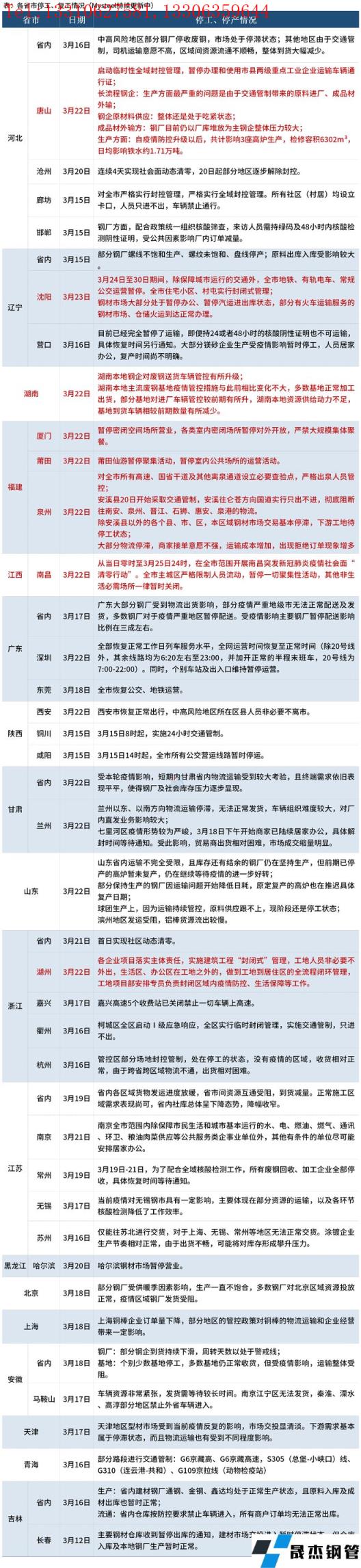 其中,3月22日,唐山市啟動(dòng)臨時(shí)性全域封控管理,暫停辦理和使用市縣兩級(jí)重點(diǎn)工業(yè)企業(yè)運(yùn)輸車(chē)輛通行證。沈陽(yáng)于3月24日至30日期間,除保障城市運(yùn)行的交通外,全市地鐵、有軌電車(chē)、常規(guī)公交運(yùn)營(yíng)暫停,全市住宅小區(qū)、村屯實(shí)行封閉式管理;厚壁無(wú)縫鋼管市場(chǎng)大部分處于暫停辦公、暫停汽運(yùn)進(jìn)出庫(kù)狀態(tài),部分有火車(chē)運(yùn)輸服務(wù)的厚壁無(wú)縫鋼管市場(chǎng)、倉(cāng)儲(chǔ)火運(yùn)到達(dá)正常辦理。3月20日福建泉州安溪縣開(kāi)始采取交通管制,除安溪縣以外的各個(gè)縣、市、區(qū),本區(qū)域厚壁無(wú)縫鋼管市場(chǎng)交易基本停滯,下游工地待停工狀態(tài)。具體情況如下: