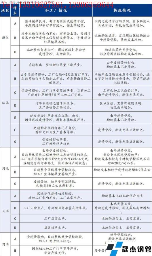 截至3月23日,匯總了部分省份19家鋼筋網片加工廠最新信息,其中浙江3家,江蘇7家,河北3家,云南4家,河南2家。從調研結果來看,江蘇、河北、河南受疫情影響較嚴重,因工程項目停工或者暫緩對于網片需求整體有遞延,導致加工廠新訂單相較于往年有個明顯的萎縮,部分沒有受太大影響的區(qū)域物流成本也有相應的增加。具體情況如下: