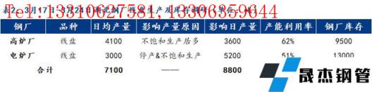 2、湖北省無縫厚壁鋼管廠家線盤日均產(chǎn)量0.71萬噸,周環(huán)比減少0.33萬噸;檢修/限產(chǎn)影響線盤日產(chǎn)量為0.88萬噸,產(chǎn)能利用率45%,較上周減少31%。