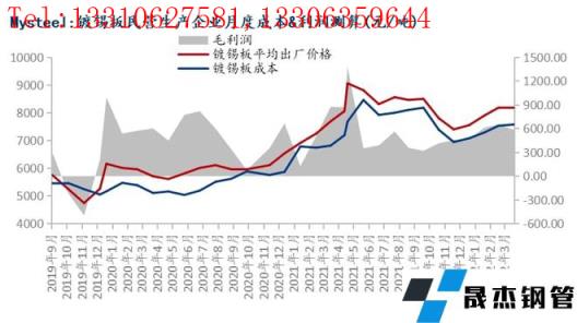 對(duì)民營(yíng)企業(yè)成本&利潤(rùn)測(cè)算數(shù)據(jù)顯示:2022年4月份鍍錫板生產(chǎn)成本7576.51元/噸,月環(huán)比增加48.2元/噸;毛利583.49元/噸,月環(huán)比下降68.2元/噸,同比下滑284.27元/噸,全流程企業(yè)整體利潤(rùn)尚可。4月基板結(jié)算成本增加、疫情影響下,運(yùn)輸成本上漲明顯,錫錠成本窄幅回調(diào),鍍錫板出廠(chǎng)價(jià)格挺價(jià)意愿偏弱。