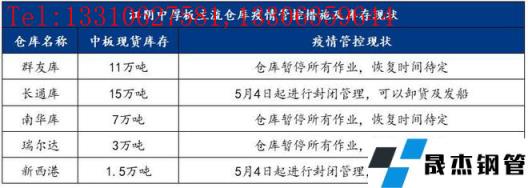 5月4日,江陰疫情爆發(fā),本地中厚板主流倉庫群友庫、南華庫、瑞爾達庫全部暫停所有作業(yè),卸貨、提貨均停止,涉及中板庫存量21萬噸。長通庫、新西港施行封閉管理,碼頭可以卸貨及發(fā)船,汽運停止,涉及中板庫存量16.5萬噸。此輪疫情管控,使得江陰本地40萬噸現(xiàn)貨中板庫存將近一半成為死庫存,另外一半流通性也大大減弱,具體明細如下:
