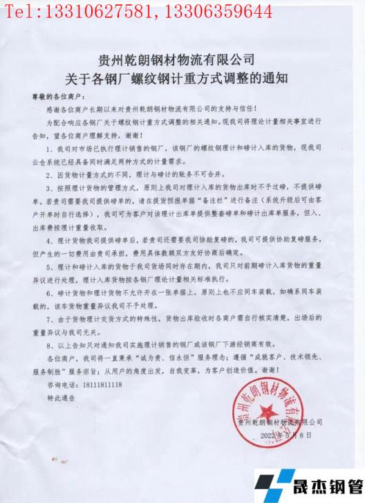 免責(zé)聲明:本網(wǎng)站(山東聊城晟杰無(wú)縫鋼管廠www.androidrecoverysoftware.com)刊載的“貴州乾朗鋼材_無(wú)縫鋼管物流有限公司關(guān)于各無(wú)縫鋼管廠家螺紋鋼計(jì)重方式調(diào)整的通知”等均源于網(wǎng)絡(luò),版權(quán)歸原作者所有,且僅代表原作者觀點(diǎn),本文所載信息僅供參考。轉(zhuǎn)載僅為學(xué)習(xí)與交流之目的,如無(wú)意中侵犯您的合法權(quán)益,請(qǐng)及時(shí)聯(lián)系刪除。本網(wǎng)站刊登此篇文章并不意味著本站贊同其觀點(diǎn)或證實(shí)其內(nèi)容的真實(shí)性,我們不對(duì)其科學(xué)性、嚴(yán)肅性等作任何形式的保證。如果侵犯了您的版權(quán),請(qǐng)盡快聯(lián)系我們予以撤銷,謝謝合作!