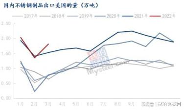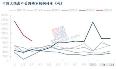 2021年,中國(guó)大陸出口美國(guó)的不銹鋼制品的量總計(jì)22萬(wàn)噸(占大陸出口總量的20.3%),2022年1-3月,該量約5.2萬(wàn)噸(占大陸出口總量的22.3%),同比增加6.8%。