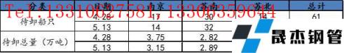 此次調(diào)研選取了南京、蘇州、無錫、常州、南通、徐州、揚州、鹽城八個城市,以建筑厚壁無縫鋼管為主要庫存的20家倉庫。通過匯總了解,當前樣本倉庫碼頭累計待卸船只總計53只,待卸總量達6.69萬噸。