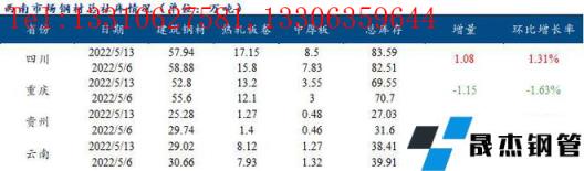 據(jù)調(diào)研,截止2022年5月13日,西南市場厚壁無縫鋼管累計社會庫存為218.58萬噸,環(huán)比減少6.14萬噸,降幅2.73%。分省份來看,本周四川市場厚壁無縫鋼管庫存為83.59萬噸,環(huán)比增加1.08萬噸,漲幅1.31%;重慶市場厚壁無縫鋼管庫存為69.55萬噸,環(huán)比減少1.15萬噸,降幅1.63%;貴州市場厚壁無縫鋼管庫存為27.03萬噸,環(huán)比減少4.57萬噸,降幅14.46%;云南市場厚壁無縫鋼管庫存為38.41萬噸,環(huán)比減少1.5萬噸,降幅3.76%。